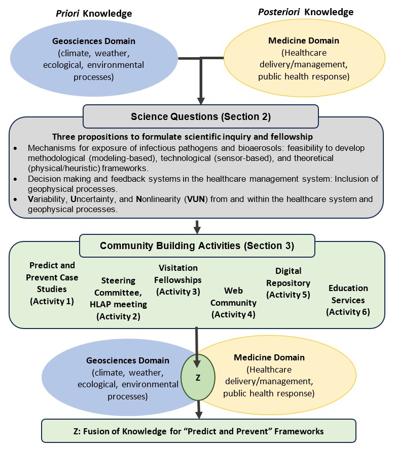 The RCN is designed to develop a dynamic platform to maximize the utility and translation of the priori and the posteriori knowledge in such a way that it creates an environment and opportunities between the two societally relevant disciplines and professionals. This RCN provide opportunities to explore how new possibilities of knowledge emerge, what constraints limit the possibilities, and how discoveries can be accelerated within geosciences and medicine domains. In providing the conceptualization, we envision and anticipate theorizing frameworks for the prediction (when, where, and how) and prevention (what) of the prevalence of infectious pathogens and associated bioaerosols, which is achievable through careful synthesis of the priori and the posteriori knowledge.